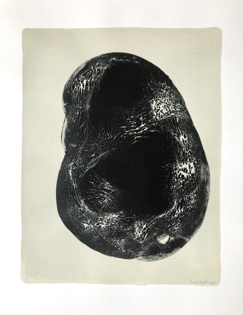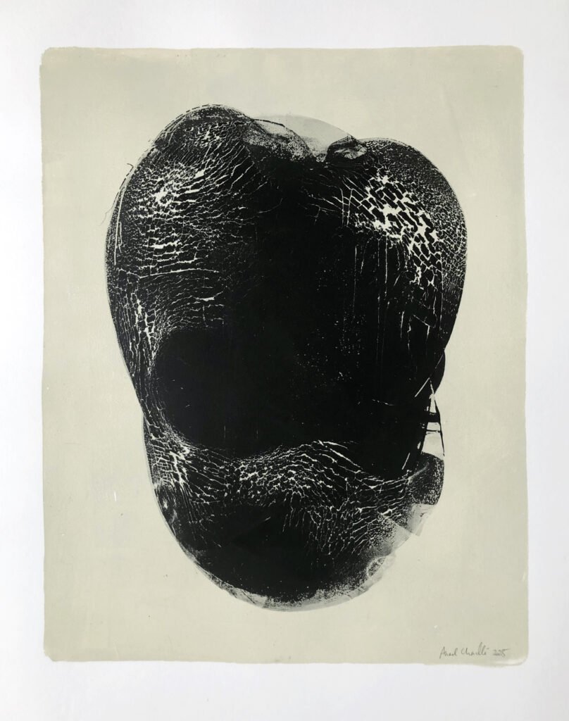 Tectoniques présente une série de peintures faisant partie d’un vaste chantier entamé en 2024 intitulé L’image en question. Les différentes pistes d’exploration, à partir d’une technique de transfert monotype à base de peinture acrylique, interrogent l’image dans sa matérialité même, incorporant entre les couches de peinture des images trouvées, fondues dans la masse. La vision devient hésitante, balbutiée dans le magma de sa matière de mémoire. Parmi ces pistes, la disparition des images, l’écriture des chairs, l’inconscient de l’image ou le rêve des continents tracent des figures possibles d’une image altérée qui trouve dans sa matérialité un antidote à son trop-plein de significations, la rendant à elle-même. Les œuvres appartenant à la série des Tectoniques introduisent une nouvelle dimension, que ce soit par l’épure des formes que par la dynamique animant la peinture : ondes sismiques, vibrations, l’image naît de l’action physique exercée par l’artiste directement sur la plaque enduite de peinture, faisant se rejoindre par ce geste le pouls de la planète qui pulse toutes les 26 secondes aux fréquences du regard.